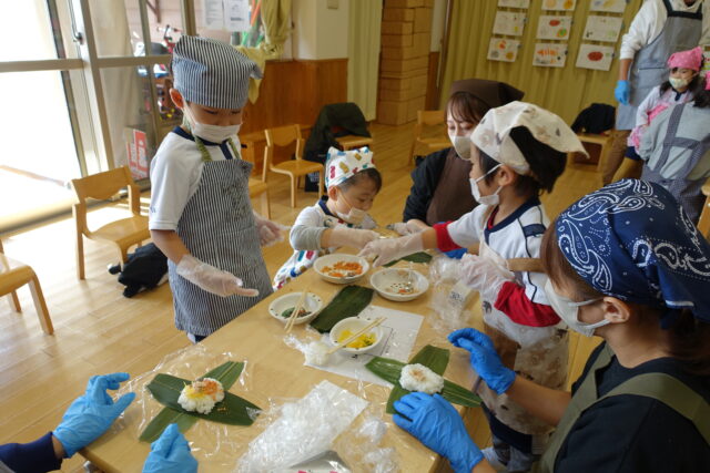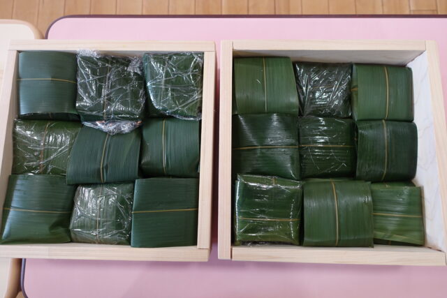 先日子どもたちがスーパーで買い物した材料を使っての笹寿司づくり。