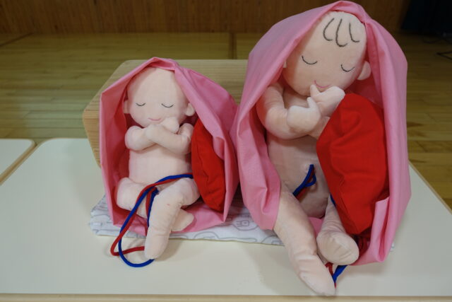 看護師が自作した赤ちゃん人形(大きさ、重さを合わせて作ってくれました)を使って説明します。